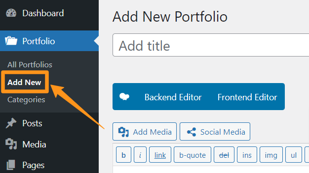 To add a new portfolio item, navigate to Portfolio > Add New. Here you can add the title of the project, a description in the main text editor, upload media, type an excerpt and assign various categories.