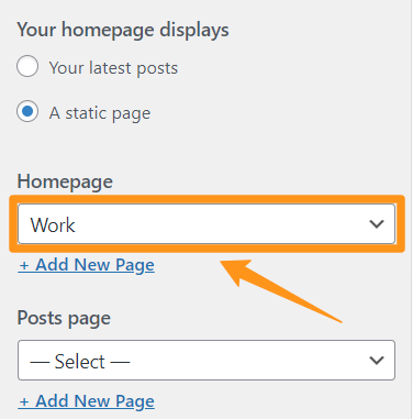 From the drop-down menu under Homepage, choose your new page as the front page for your site.