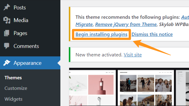 After activating the theme you will see a notice at the top of the screen. This notice is to let you know about the plugins that we recommend you install for use with the theme.
