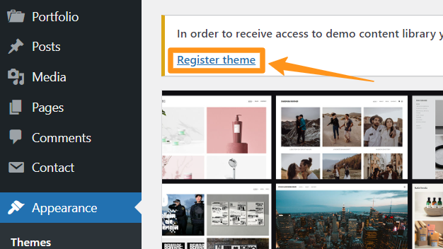 To register the theme, click Register theme at the top of the screen or go to Appearance > Register Theme and activate your copy of the theme by entering your purchase code.